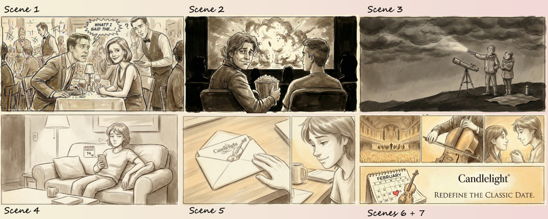 A fast-paced montage exposing the failures of the "old standards": a chaotic dinner, a loud action movie, and a stargazing trip ruined by bad weather. The tension builds until a golden light transforms the mundane living room into a stunning, candlelit venue.