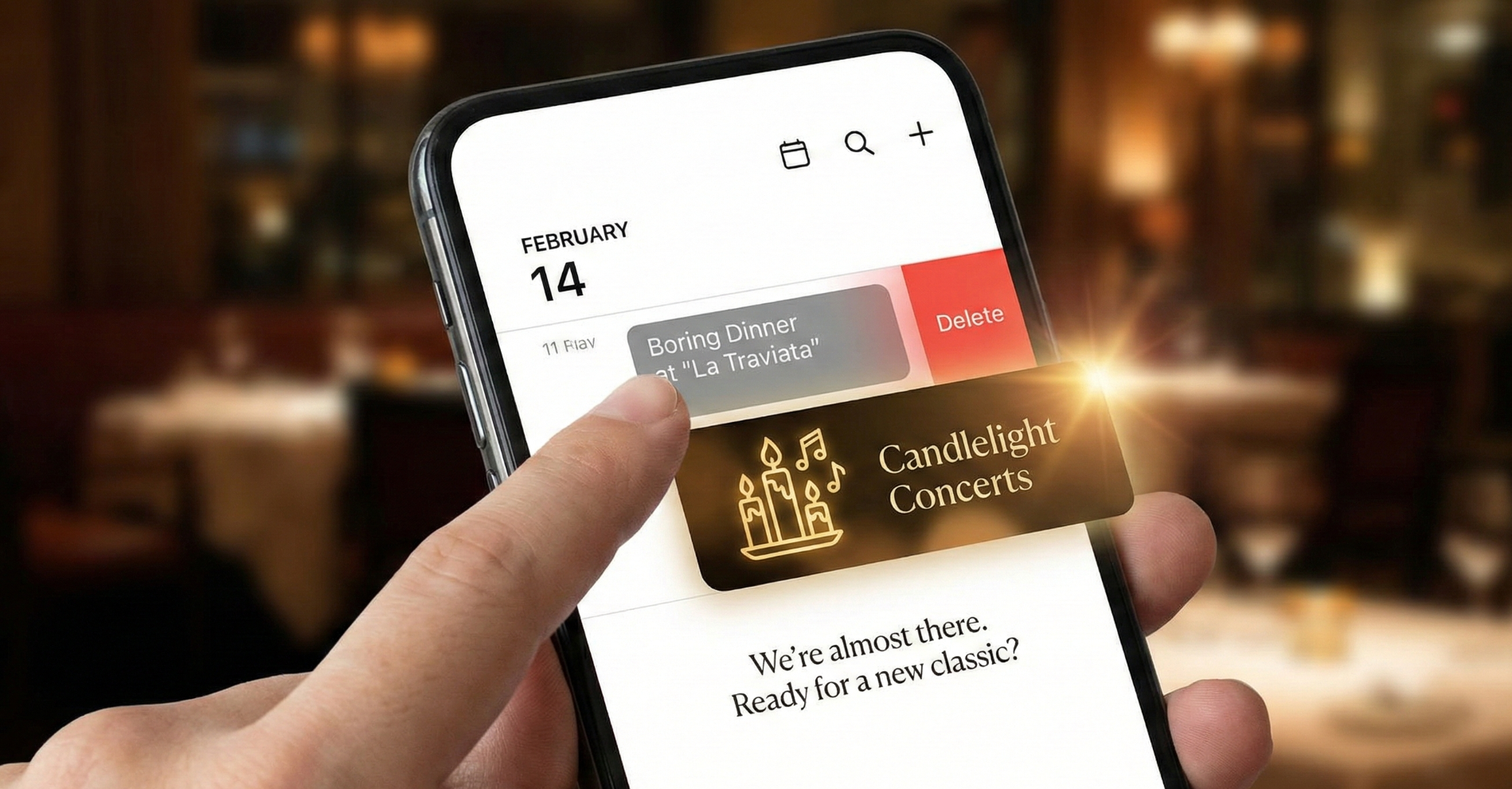 A social teaser that mimics the user interface of a calendar app. The user literally "swipes" away the boring dinner reservation to reveal the glowing Candlelight icon.